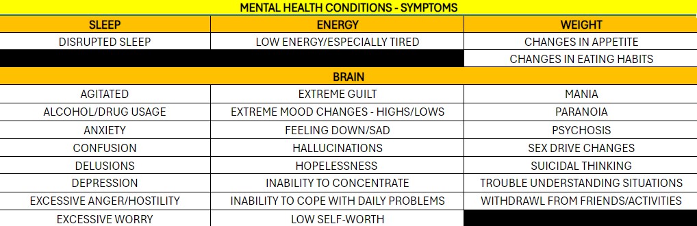 Mental illness can include but not limited to addictive behaviours, ADHD, anxiety, bi-polar, depression, eating disorders, obsessive-compulsive disorder (OCD), and schizophrenia.