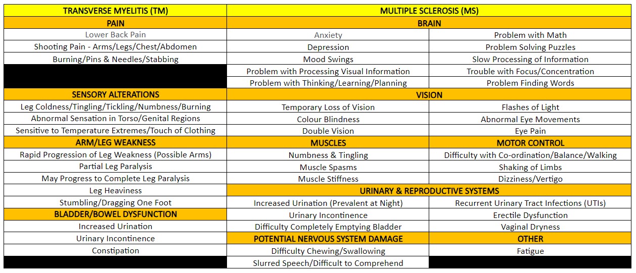 TM patients carry a single lesion in the spinal cord. MS patients have multiple lesions and pronounced inflammation throughout the brain and spinal cord.