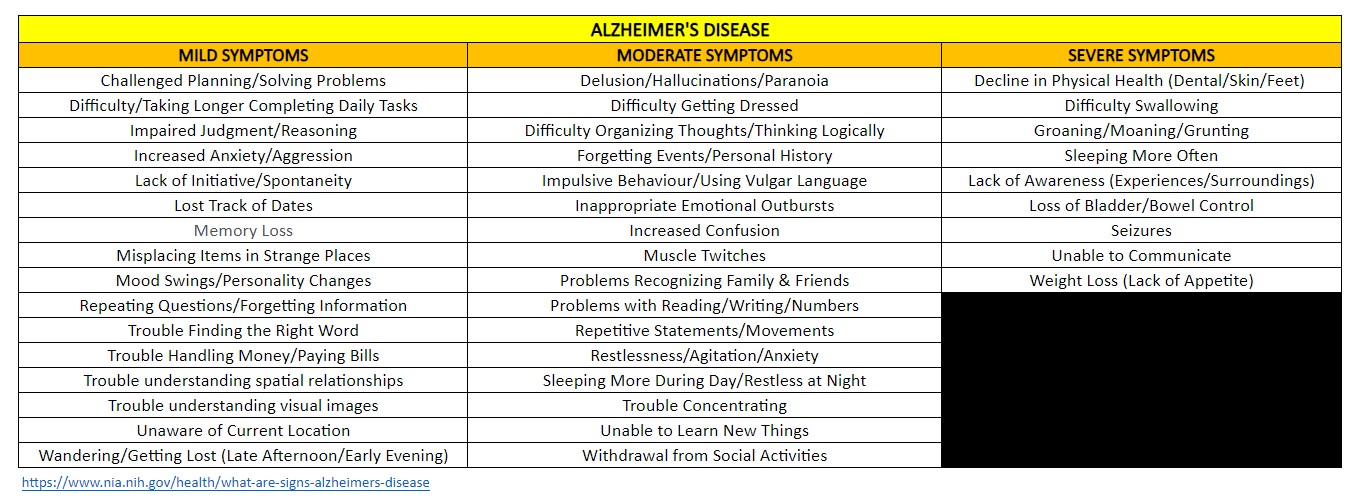 The symptoms of Alzheimer’s (noted on the right) can vary from one person to the next.